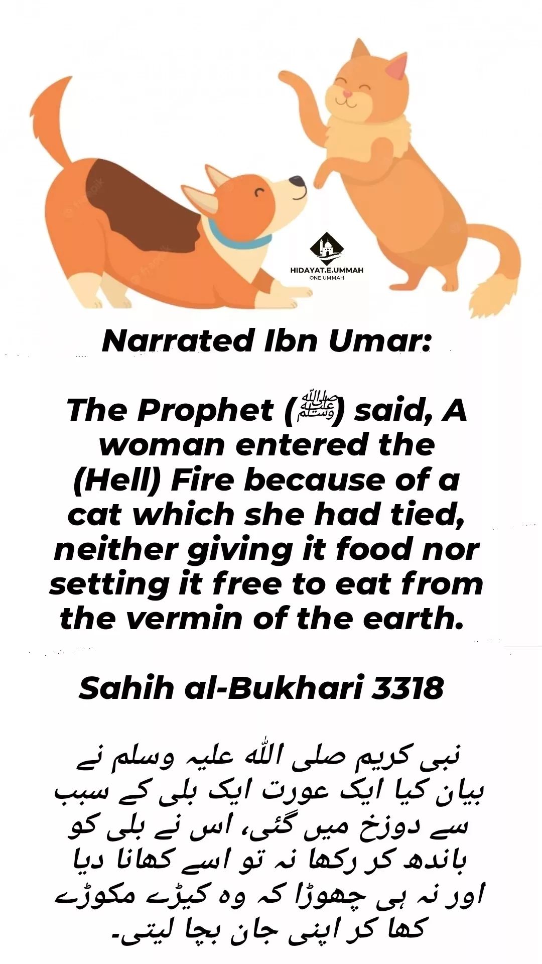 1. This hadith narrates a story about a woman who was punished by Allah and entered the Hellfire because of her mistreatment of a cat.