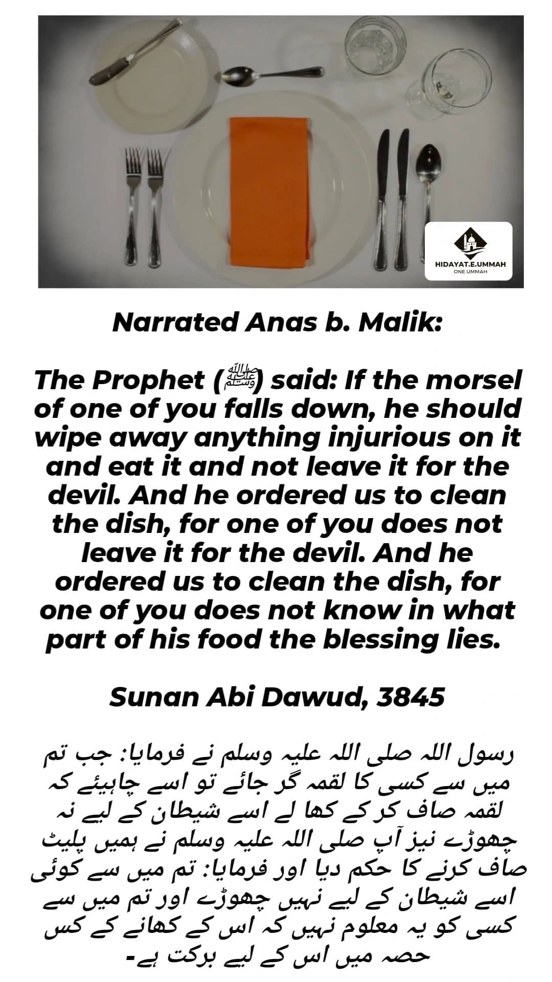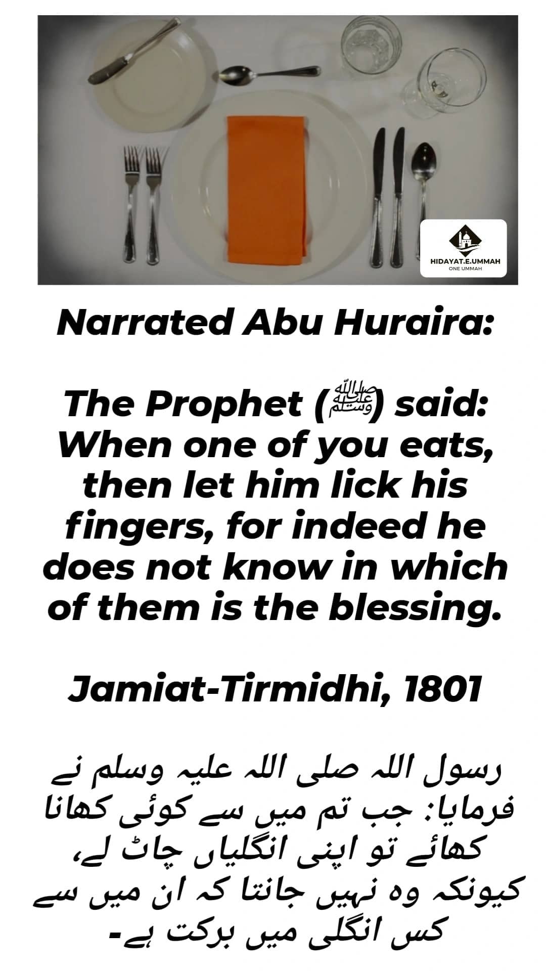 1. This hadith, narrated by Abu Huraira, advises Muslims to lick their fingers after eating.