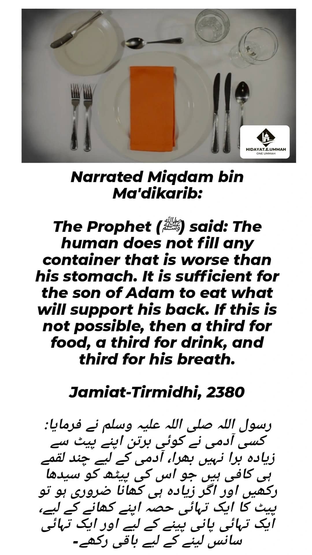 1. This hadith highlights the negative impact of overeating, comparing the stomach to a container that should not be overfilled.