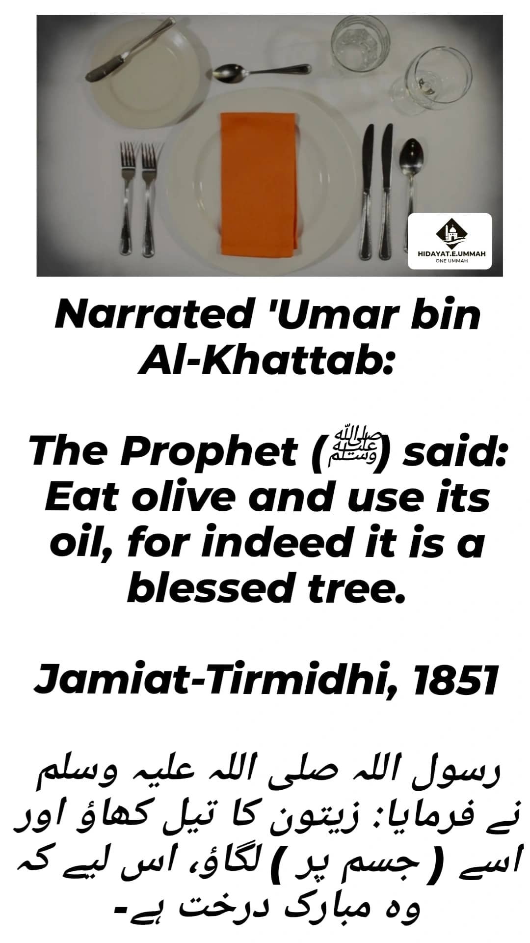 1. This hadith is narrated by Umar bin Al-Khattab, where the Prophet Muhammad (peace be upon him) advises the consumption and use of olive and its oil.