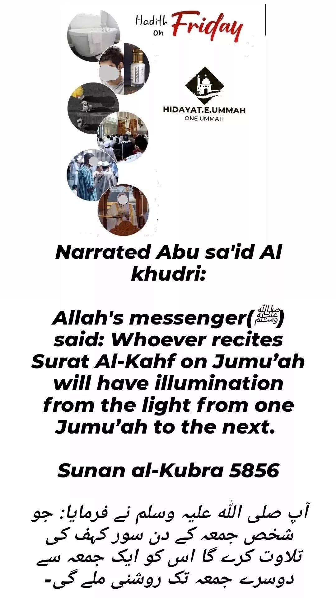 5. The message encourages Muslims to make a habit of reciting Surah Al-Kahf every Friday, as it brings spiritual benefits and closeness to Allah.