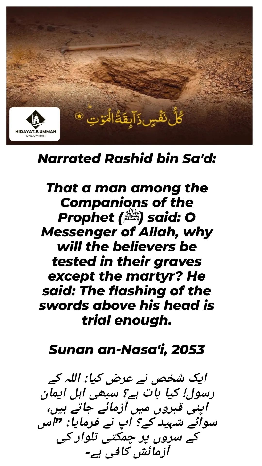 1. This hadith, narrated by Yahya bin Sa'eed, discusses the trial that people will face after their death.