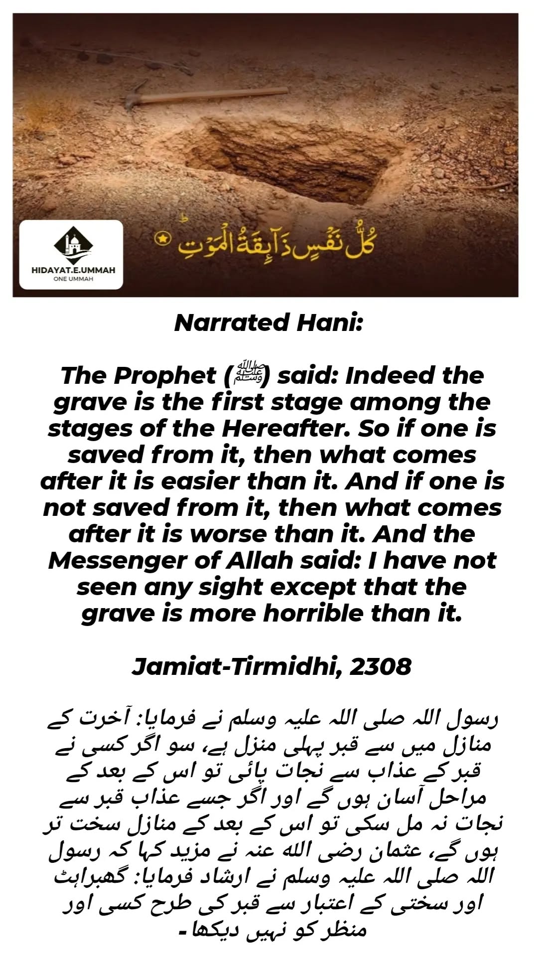 1. This hadith, narrated by Hani, highlights the significance of the grave as the first stage in the Hereafter.