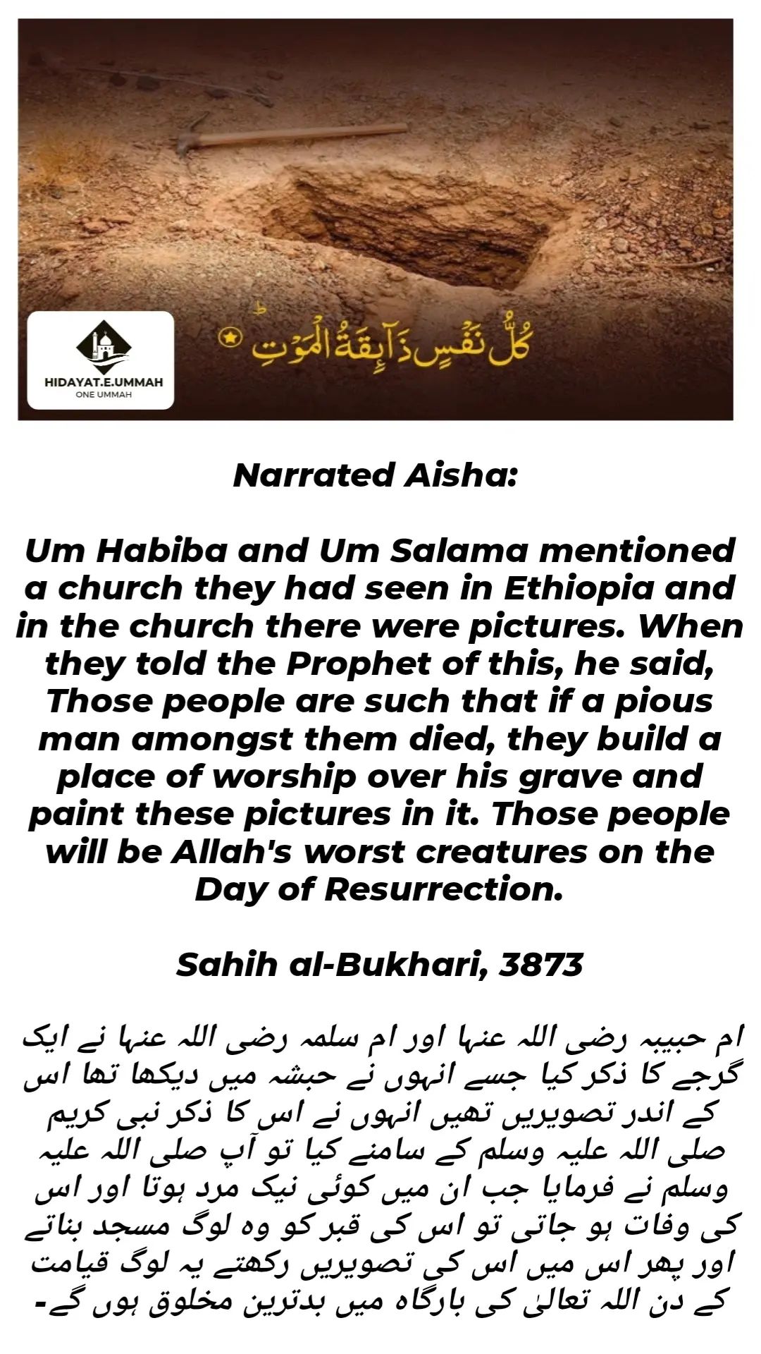 1. In this hadith, Um Habiba and Um Salama describe a church they saw in Ethiopia, which had pictures on the walls.