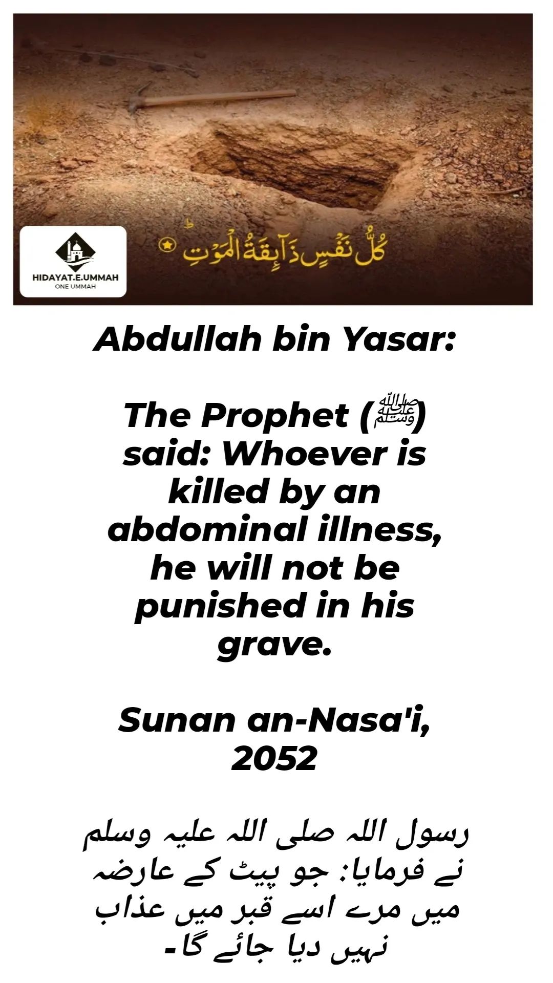 1. In this hadith, the Prophet (peace be upon him) mentions that a person who dies due to an abdominal illness, such as a stomach condition or related disease, will not be punished in the grave.