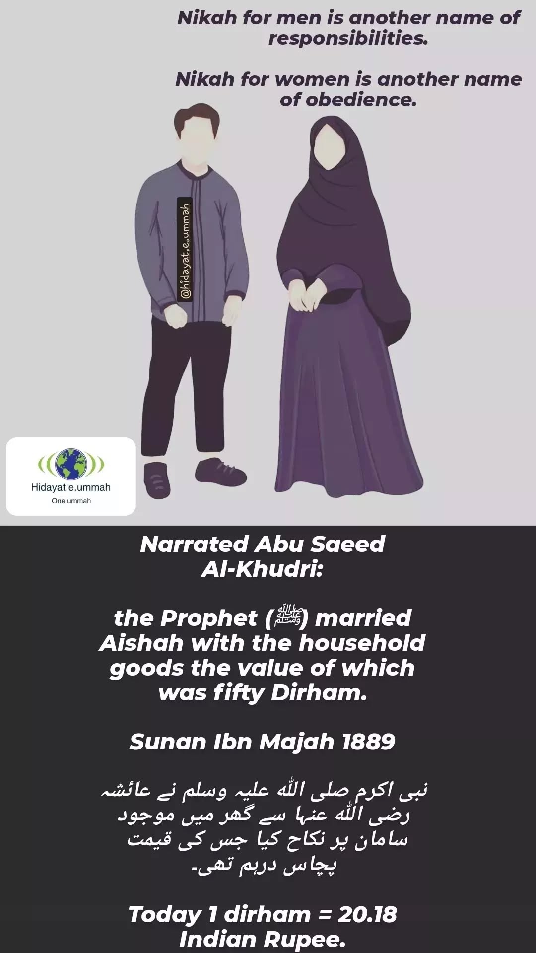 - The Prophet Muhammad (peace be upon him) married Aisha with a modest dowry of fifty Dirhams, demonstrating that marriage does not need to be extravagant or financially burdensome.