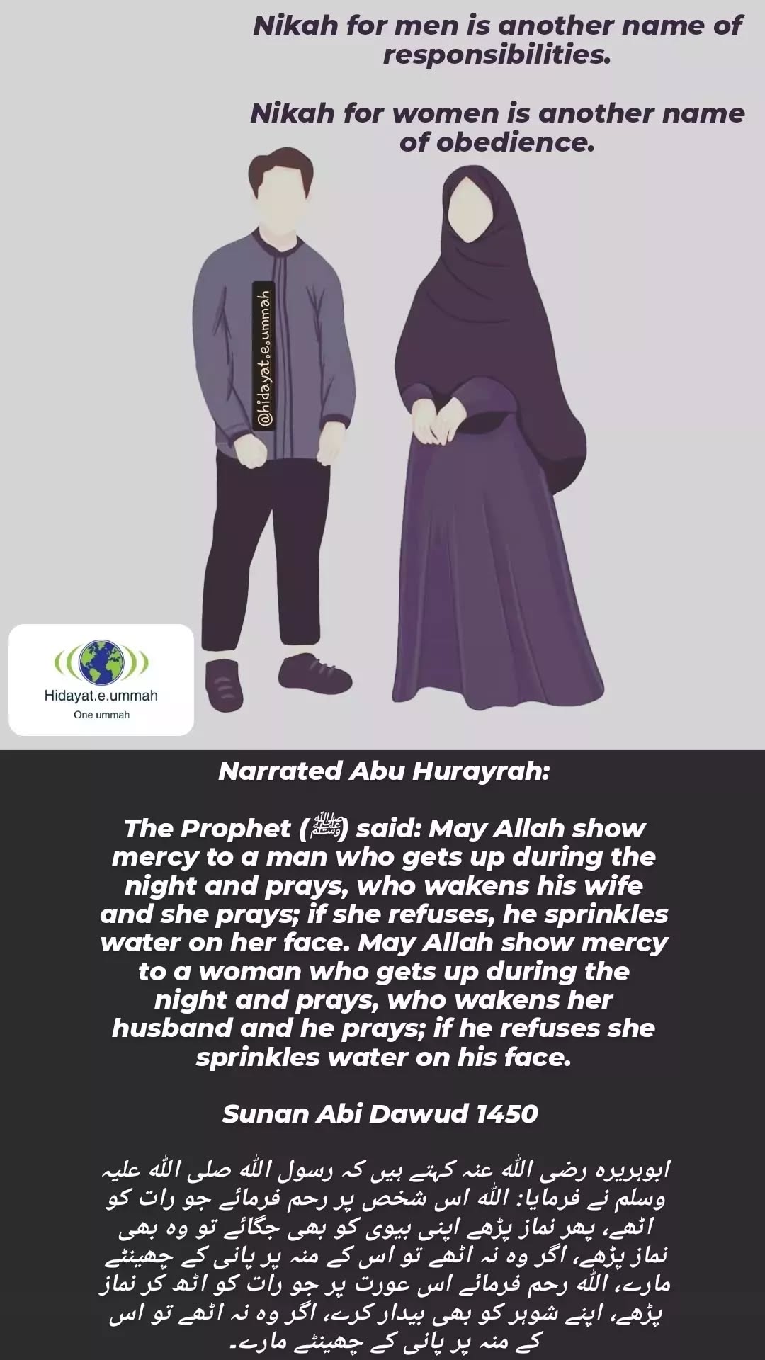 - The Prophet (peace be upon him) praises couples who support each other in performing night prayers (Tahajjud). A husband who wakes up and prays and encourages his wife to do the same is greatly rewarded by Allah.