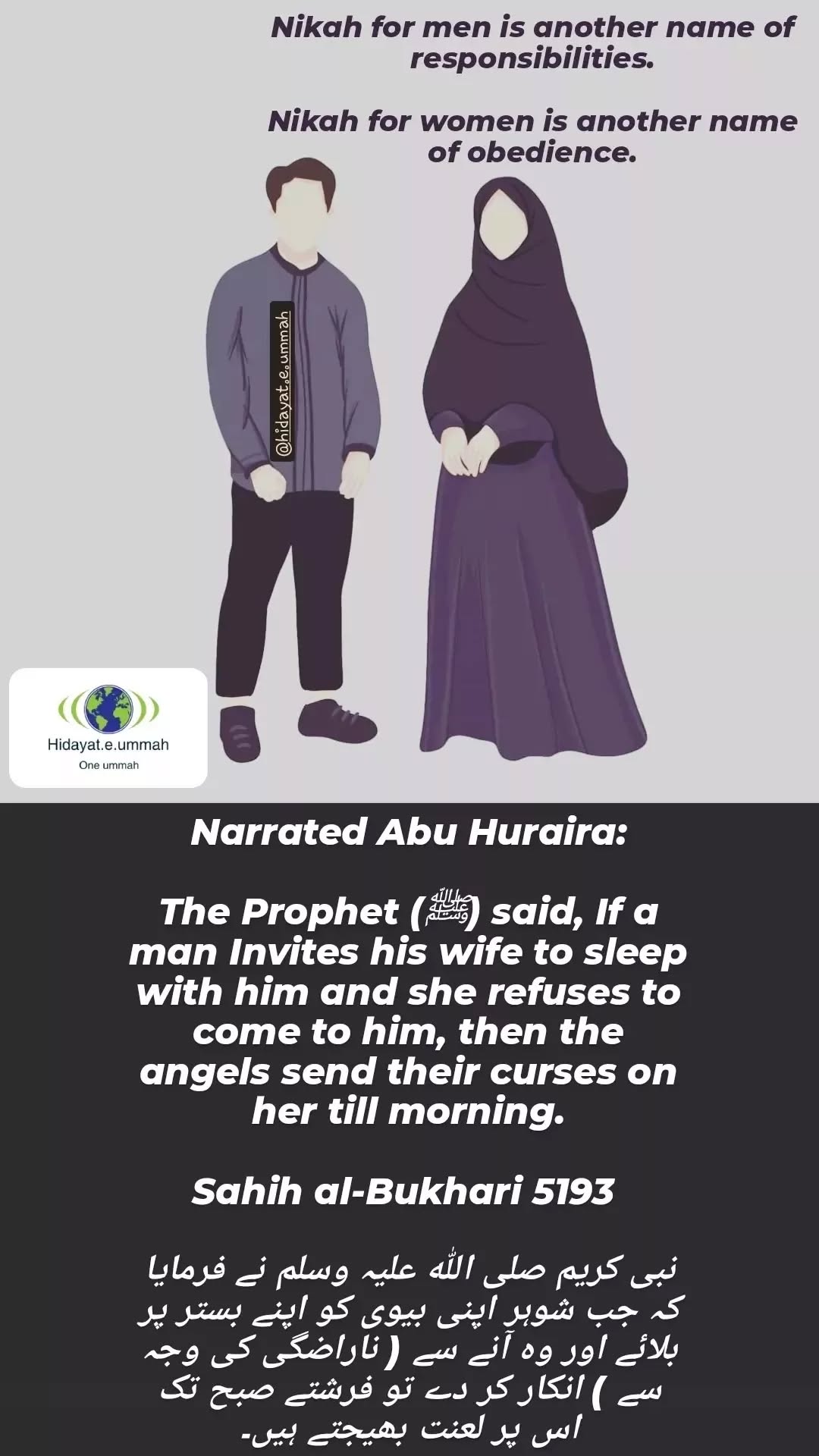 This hadith, narrated by Abu Huraira (may Allah be pleased with him), emphasizes the importance of fulfilling marital rights and obligations, particularly in the relationship between husband and wife.