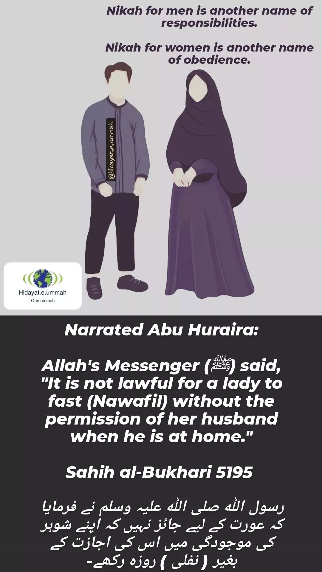 This hadith, narrated by Abu Huraira (may Allah be pleased with him), addresses the issue of a wife fasting voluntary (Nafl) fasts while her husband is present.