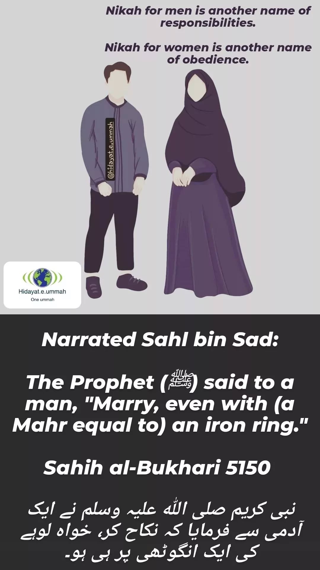 - The Prophet Muhammad (peace be upon him) instructed a man to marry even if the dowry (Mahr) was as simple as an iron ring, demonstrating that marriage does not need to be financially burdensome.
