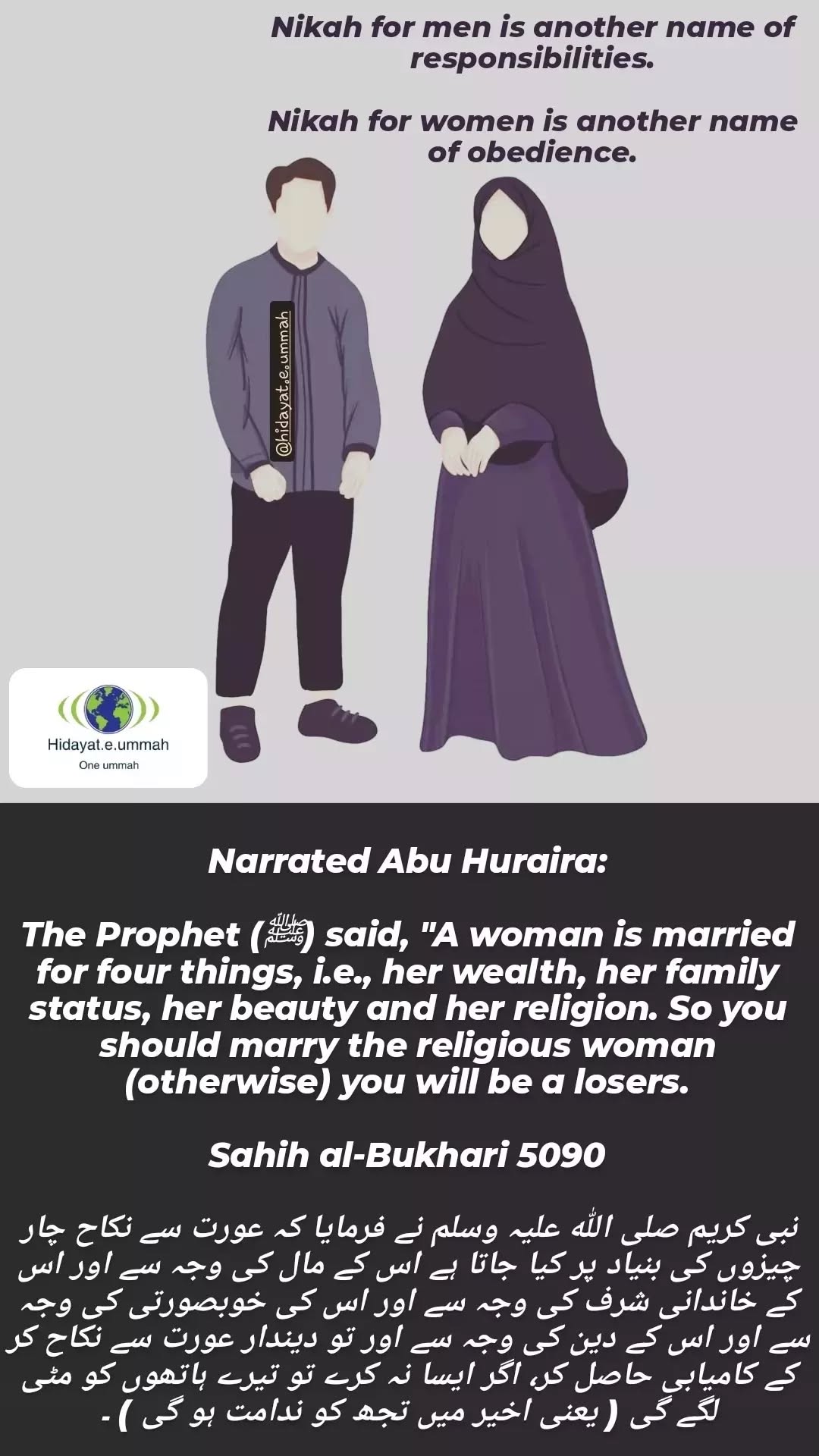 This hadith, narrated by Abu Huraira (may Allah be pleased with him), highlights the key considerations for choosing a spouse in Islam and prioritizing religious values.